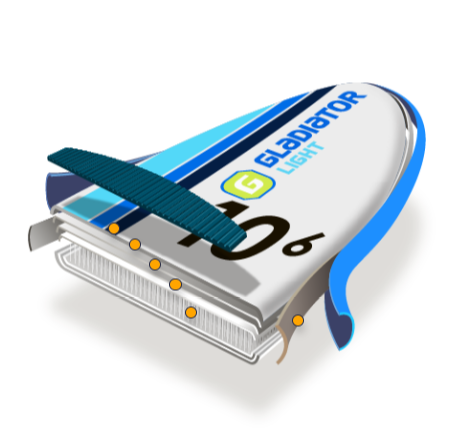 Модель изготовлена из высококачественного двухслойного ПВХ на прочной тканевой основе плотностью 1000 den. Дополнительную жесткость ей обеспечивают двойной усиленный кант по бокам и стрингера - широкие полосы армированного ПВХ с верхней и нижней стороны доски.